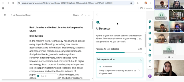 Доктор Джастін Джеймс представив план заняття. Питання, які пропонувались здобувачам, були різноманітними і дискусійними та стосувалися можливостей і переваг використання ШІ в академічних текстах.
