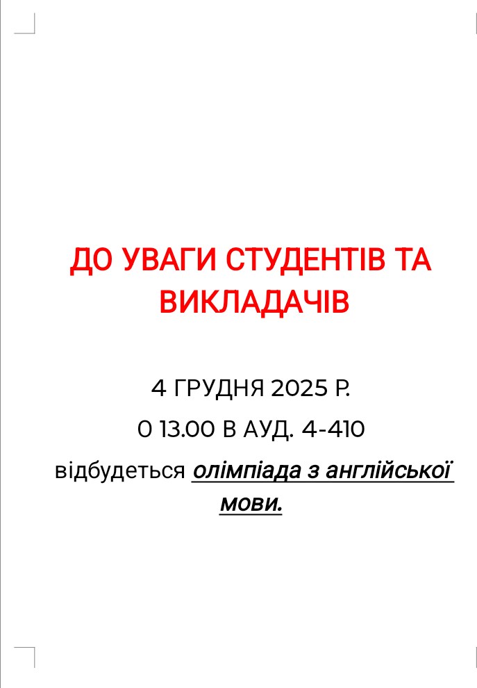 Олімпіада з англійської мови24.11.202524.11.2025 ДО УВАГИ СТУДЕНТІВ ТА ВИКЛАДАЧІВ. 4 ГРУДНЯ 2025 р. О 13.00 в ауд. 4-410 відбудеться олімпіада з англійської мови.